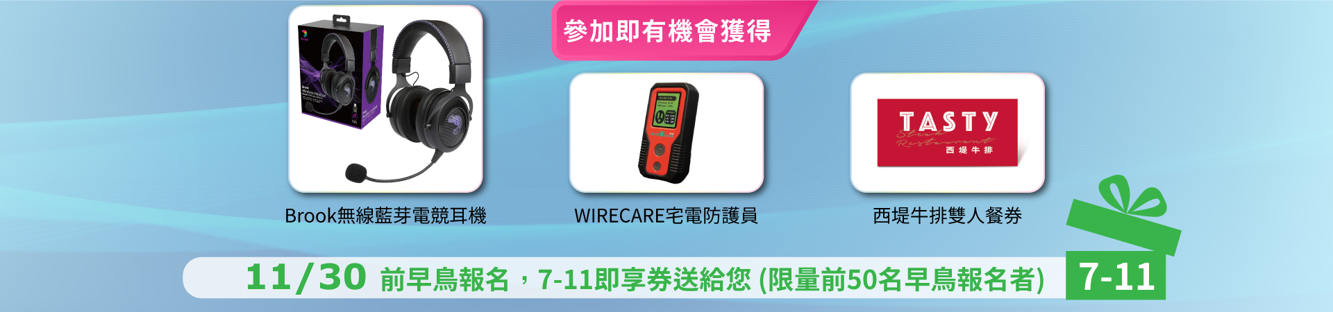符合早鳥報名者,將寄送兌換通知碼,報到時請出示,可兌換7-11實體即享券
