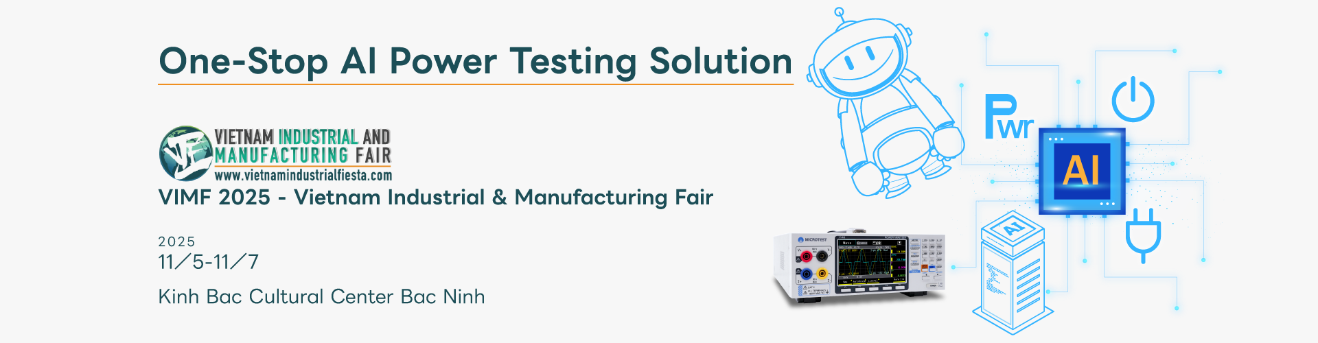 MICROTEST CORPORATION will be showcasing its comprehensive AI server power and component validation solutions at the Vietnam Industrial & Manufacturing Fair (VIMF 2025), held from November 5 to November 7, 2025, at the Kinh Bac Cultural Center, Bac Ninh, Vietnam.