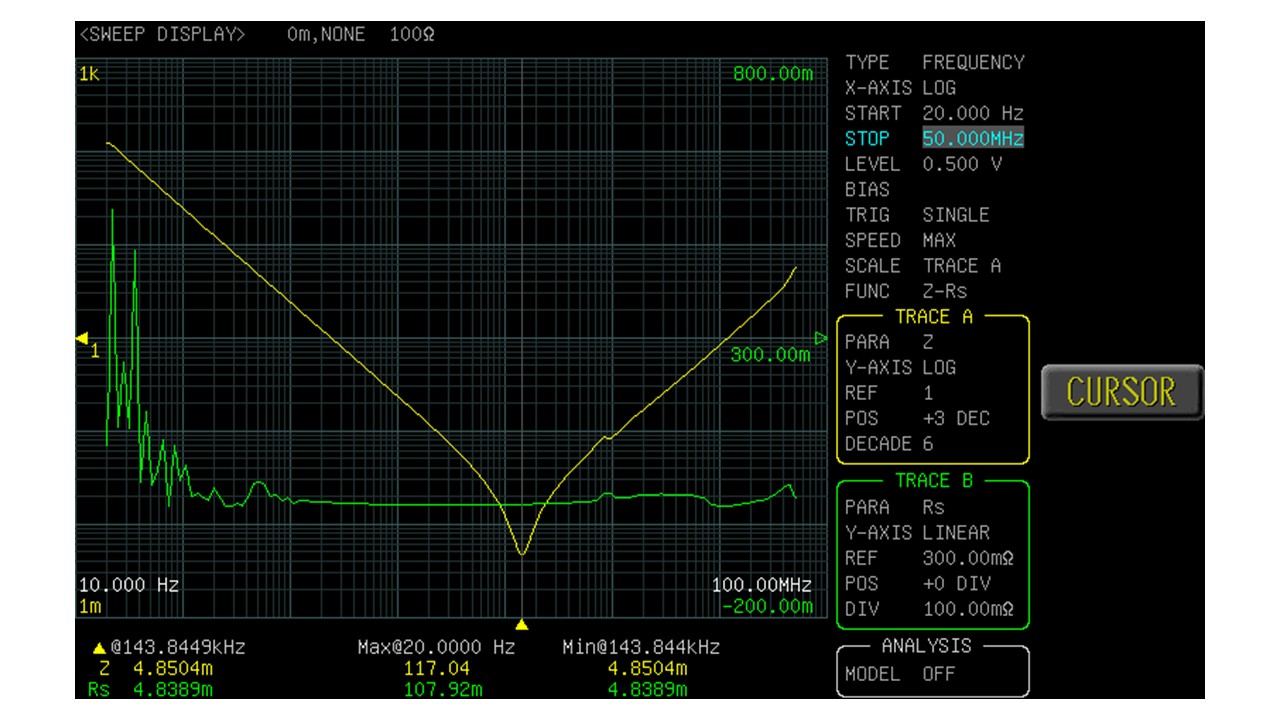 MICROTEST 6632C is designed for ESR measurement of capacitors from 10 Hz to 10 MHz, supporting performance evaluation across a wide frequency range. In Meter Mode, it provides real-time ESR readings. In Sweep Mode, it analyzes impedance (Z) and phase (θ) vs. frequency to identify the Self-Resonant Frequency (SRF), revealing high-frequency behavior.