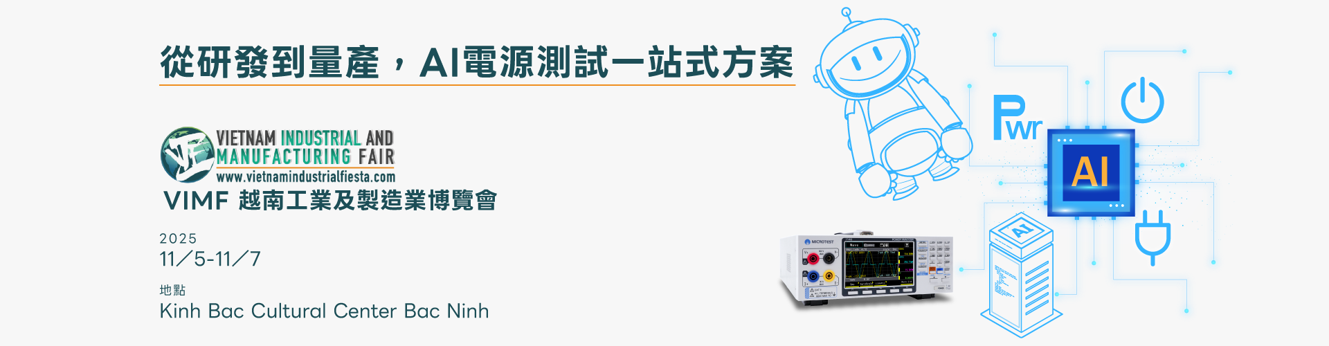MICROTEST 將於 2025年11月5日至11月7日 在越南北寧市 Kinh Bac Cultural Center 舉辦的 Vietnam Industrial & Manufacturing Fair (VIMF 2025),展出AI伺服器電源與元件驗證 的完整量測解決方案。