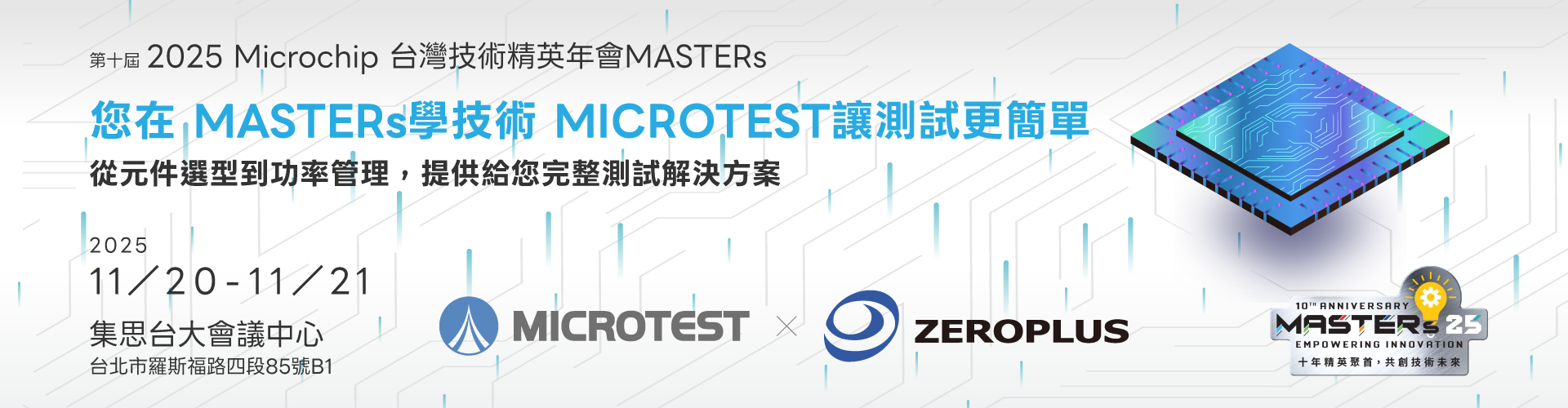 2025 年 11 月 20–21 日,第十屆 Microchip 台灣技術精英年會 MASTERs 將於台北集思台大會議中心盛大登場,本次活動聚焦於嵌入式控制技術、電源管理與實務應用,為產業研發人員與工程師打造深度技術交流與實作體驗的平台。 MICROTEST 將於活動現場展出最新一代功率分析儀與高功率電感磁飽和/溫升電流分析測試系統,協助工程師在嵌入式系統與電源驗證過程中,快速掌握元件與系統的真實效能,縮短開發週期並提升設計可靠度。