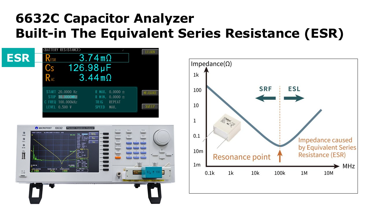 MICROTEST 6632C is designed for ESR measurement of capacitors from 10 Hz to 10 MHz, supporting performance evaluation across a wide frequency range. In Meter Mode, it provides real-time ESR readings. In Sweep Mode, it analyzes impedance (Z) and phase (θ) vs. frequency to identify the Self-Resonant Frequency (SRF), revealing high-frequency behavior.