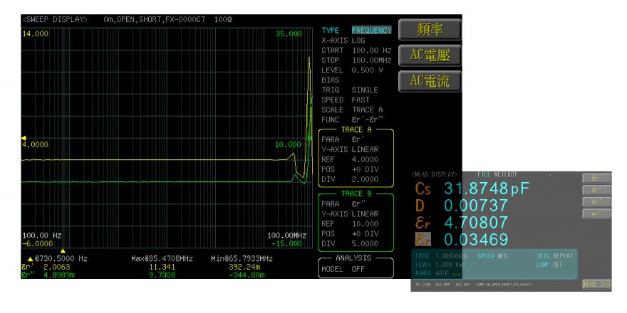 透過交流電源(AC)為材料提供激勵信號,同時監測材料上的實際電壓,藉由測量材料的尺寸與電容值+損耗因子D值,得到材料的相對介電常數εr